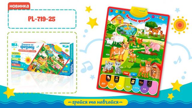 Інтерактивний плакат PL-719-25 - музичний, і дуже цікавий плакат серії "Подорож на ферму" для вивчення домашніх тварин мам і їх дітей українською мовою.