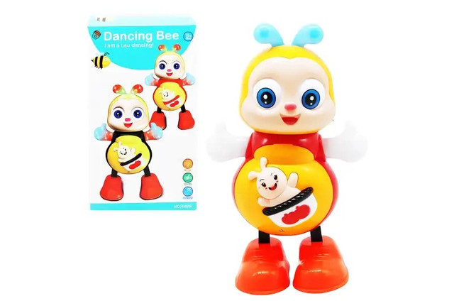Іграшка музична "Танцююча бджілка", упаковка - картонна коробка. Іграшка енергійно рухається під веселу мелодію, світиться. Тип живлення – батарейки. Матеріал – пластик.